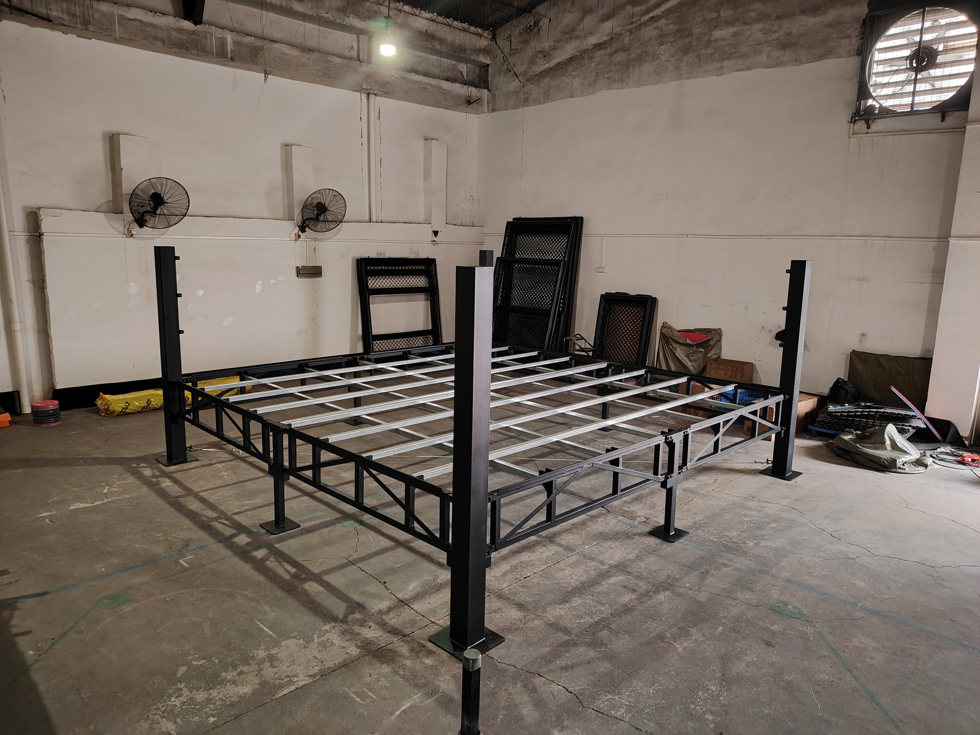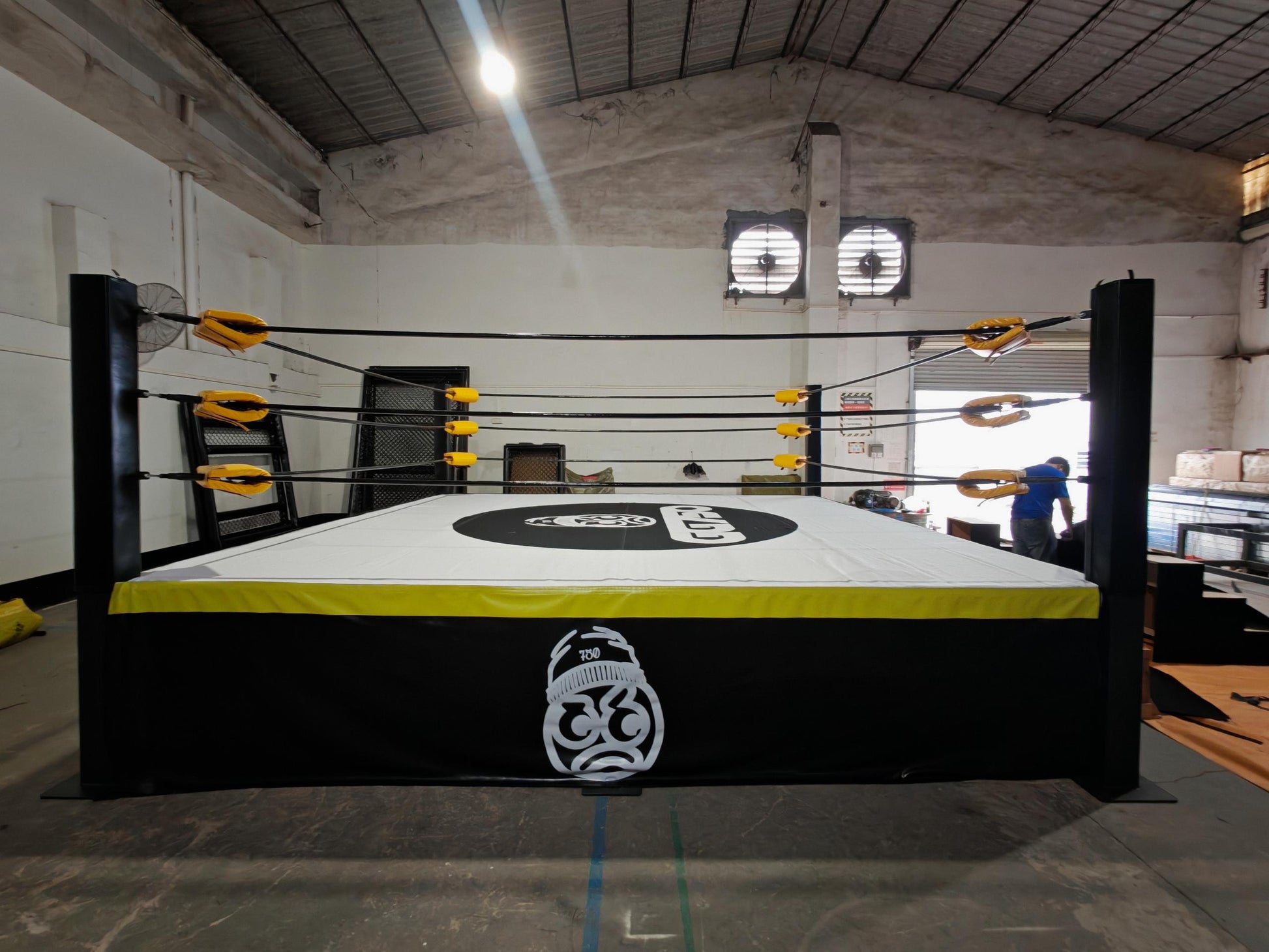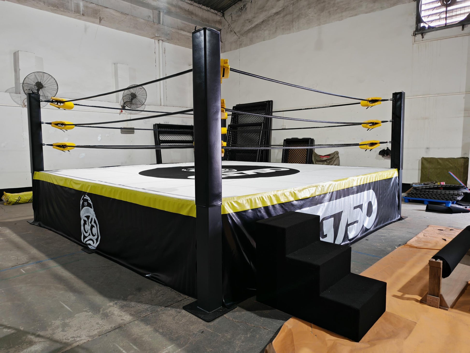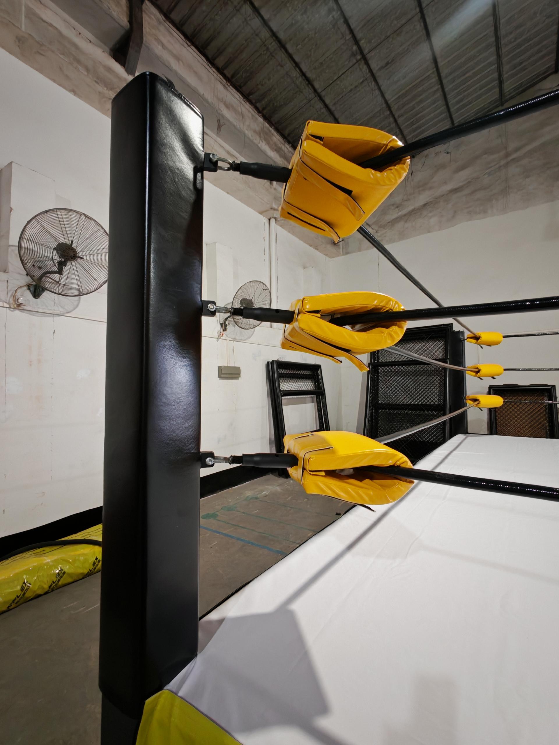 Built from structural-grade welded steel, the ring features a robust platform supported by secure under-ring tension cables and reinforcement posts. The flooring includes plywood boards topped with high-density bump padding and premium canvas, all bordered by lightweight, durable ring skirts.
